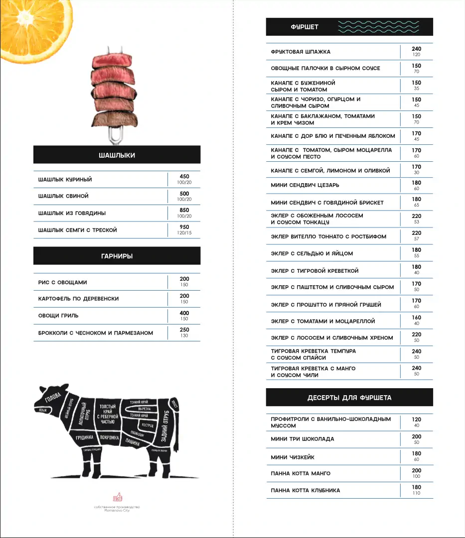 Банкетное меню — предмет гордости команды поваров: тут и фирменные эклеры, и запеченные мидии, и хамон, и любимая классика в авторском прочтении. И вы, и ваши гости 100% оценят!